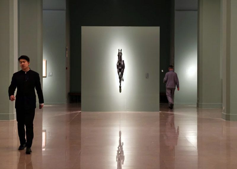 嘉宾观看“骏驰云章——中国美术中的马”展。展览分“万马奔腾”“松风逸骏”“边塞牧歌”“金戈铁马”和“以梦为马”5个篇章,集中呈现81位艺术家创作的84件作品。