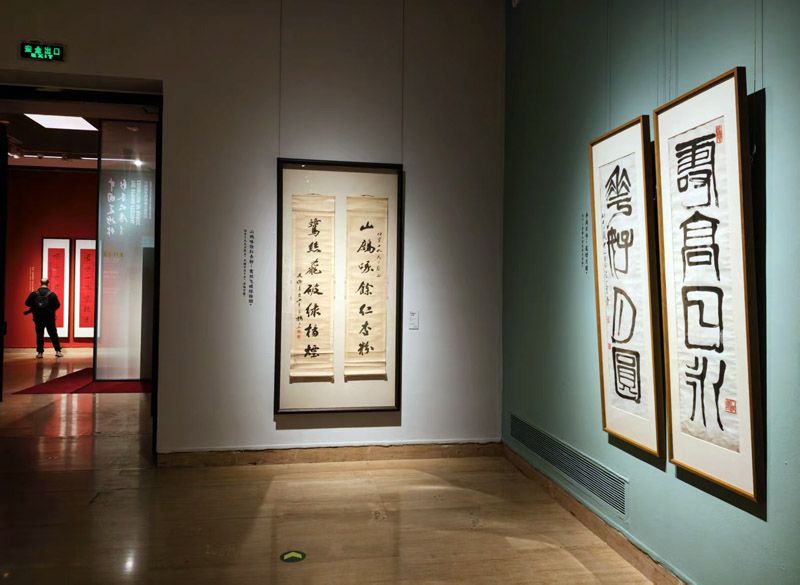 嘉宾参观“跃马春风——中国美术馆楹联书法作品展”,图右为齐白石1951年创作的《寿高花好四言联》。