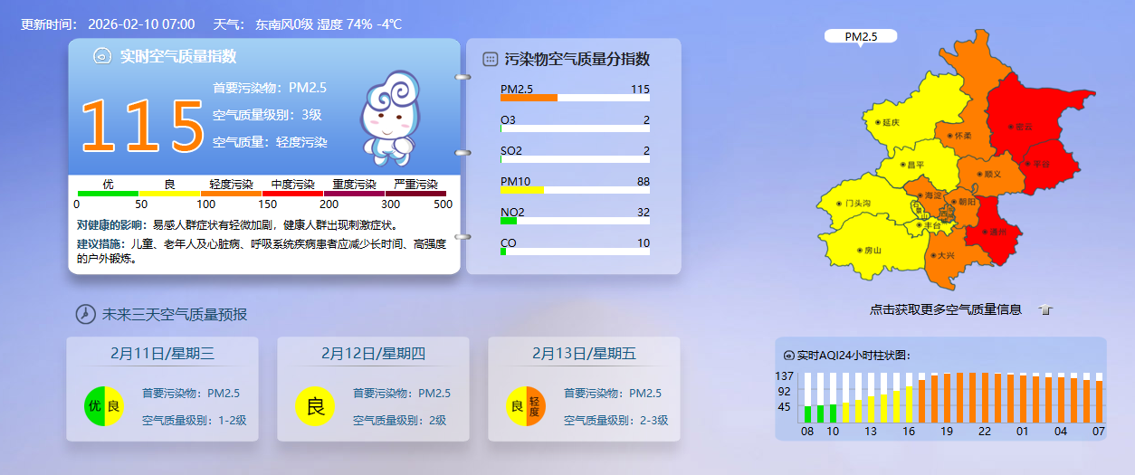 据北京市生态环境监测中心今早7时数据,目前实时空气质量指数115,空气质量轻度污染。
