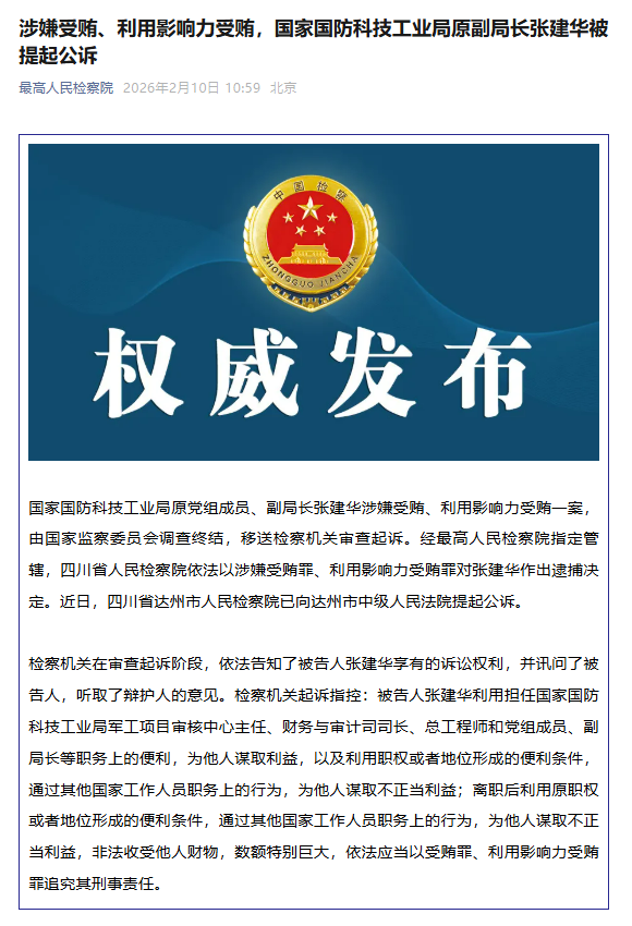 新京报讯 据最高人民检察院微信公众号消息,国家国防科技工业局原党组成员、副局长张建华涉嫌受贿、利用影响力受贿一案,由国家监察委员会调查终结,移送检察机关审查起诉。经最高人民检察院指定管辖,四川省人民检察院依法以涉嫌受贿罪、利用影响力受贿罪对张建华作出逮捕决定。近日,四川省达州市人民检察院已向达州市中级人民法院提起公诉。