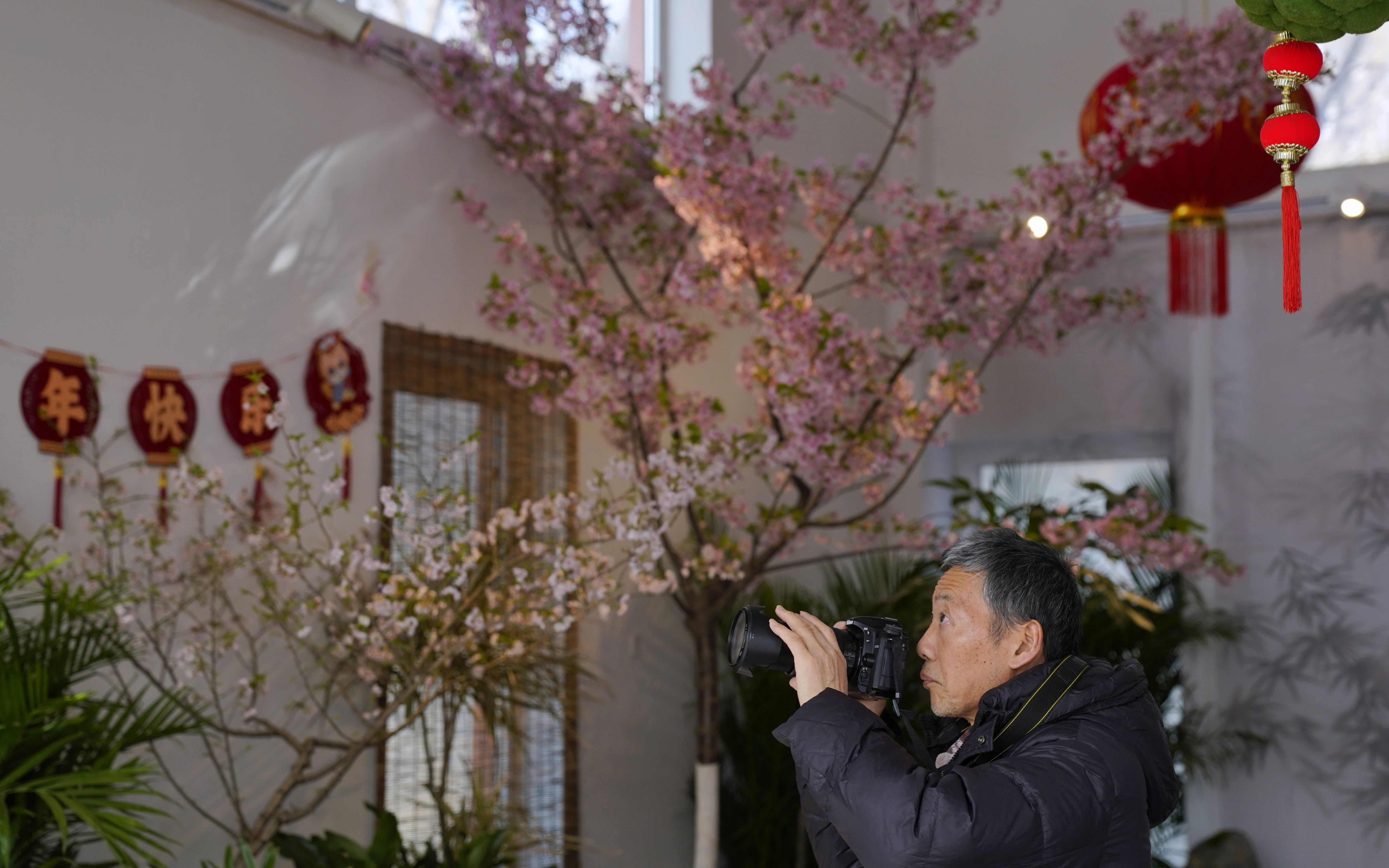 2月10日,玉渊潭公园室内樱花展,游客在拍摄公园促培的樱花。新京报记者 薛珺 摄