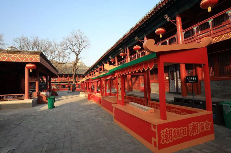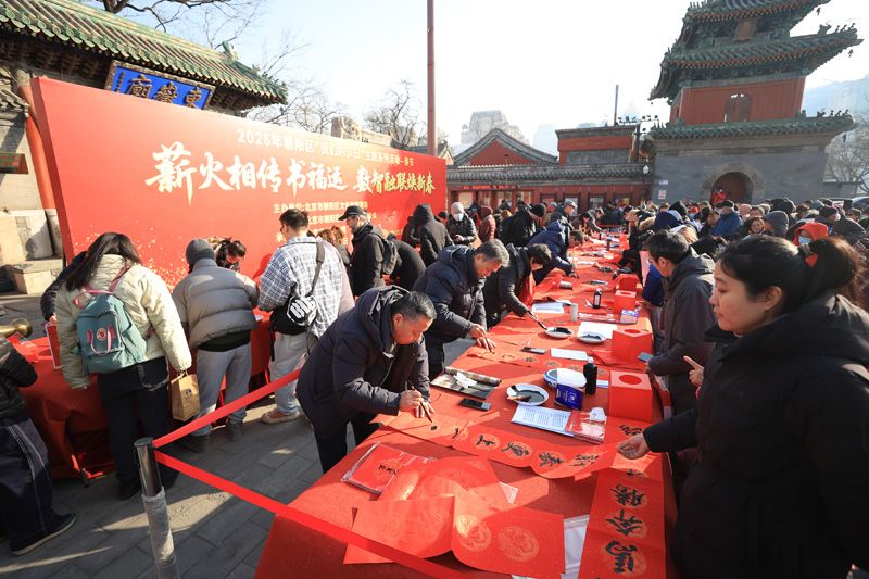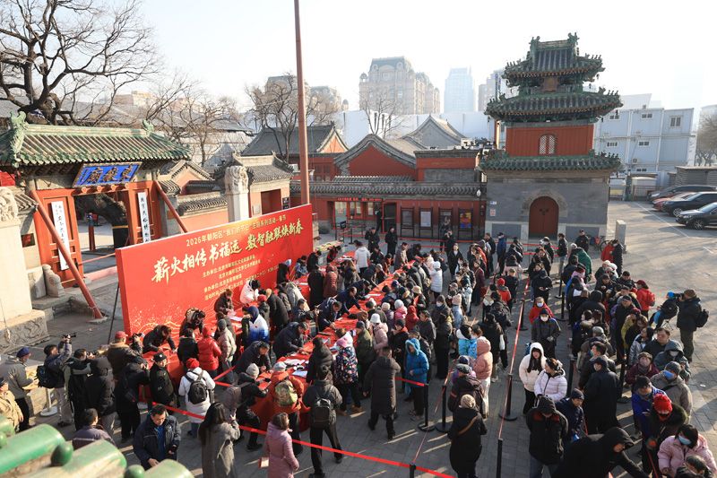庙会摊位已就绪。 此次小年送春联活动是2026年第28届北京东岳庙庙会的预热环节。2月17日至2月21日(农历初一至初五),“东岳迎祥驰骏马 北顶纳福贺新春”双庙庙会将在东岳庙与北顶娘娘庙同步启幕。