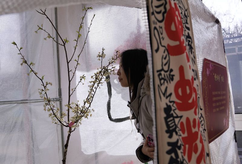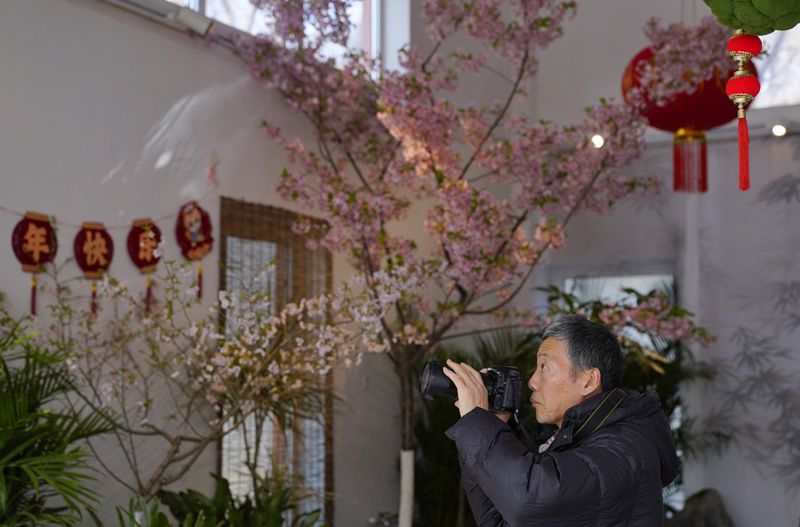 2月10日是农历腊月二十三,正值北方“小年”。玉渊潭公园小樱驿站内,游客拍摄樱花。公园通过精心促培,让樱花与紫藤首次在早春同时绽放。