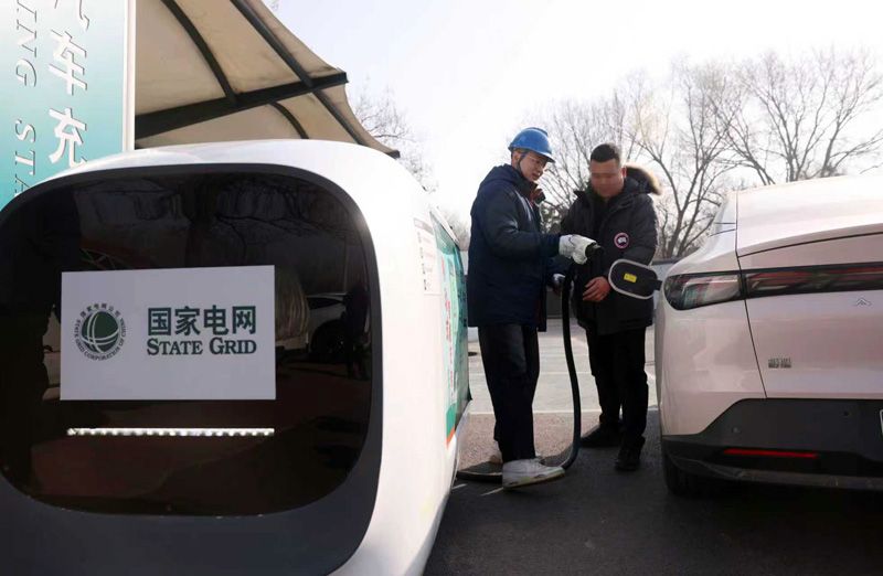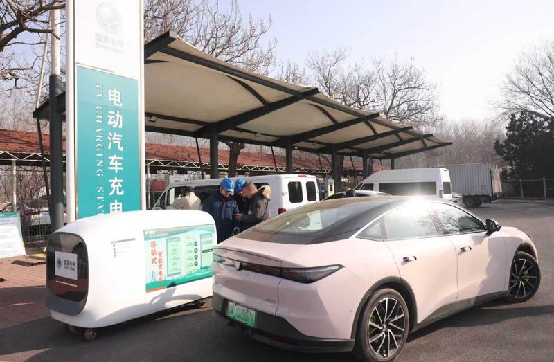 2月10日,通州区田家府服务区电动车充电站,工作人员引导车主利用移动式智能充电车充电。春节假期重点时段,运维人员将在服务区充电站开展现场值守,确保快速响应车主需求。