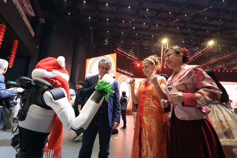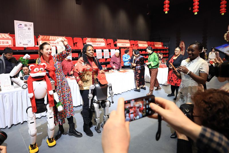 互动体验区设置了汉服打卡、AI徽章制作、“骐骥闯关”游戏、亲子手工坊、剪纸、写福字等活动。图为外籍友人与机器人合影。