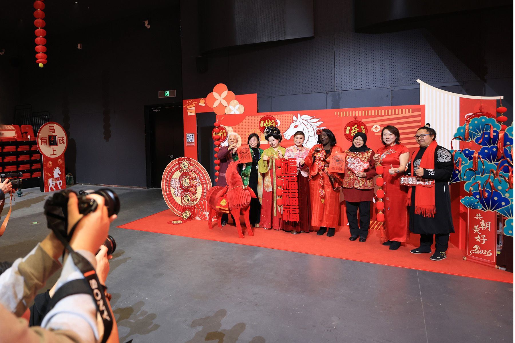 2月10日,麦子店街道第十八届中外居民过大年活动暨麦家谷子大集在微博IN跨次元引力场热闹开锣。来自塞尔维亚、英国、法国、莫桑比克、乌兹别克斯坦、土耳其、赞比亚等10余个国家的40余位外籍友人与本地居民、企业代表等齐聚一堂,尽情领略传统文化与时尚潮玩的独特魅力,共庆马年新春佳节,共叙邻里深厚情谊。图为外籍友人与中国居民合影留念。