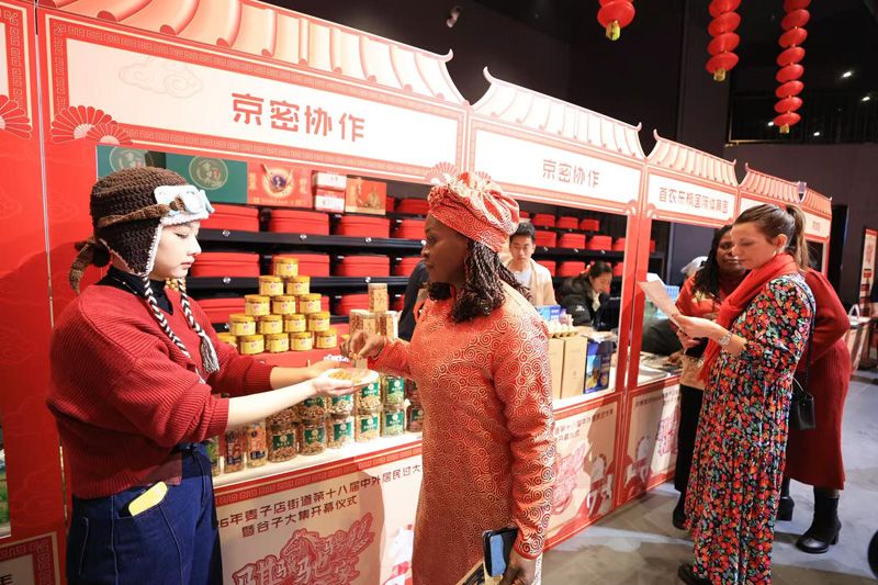 外籍友人在集市上品尝美食。麦子店街道将“文化传承+跨文化融合+潮玩消费”理念融入马年新岁,展示了地区国际化建设的丰硕成果,更是“生产、生态、生活”“三生共融”理念的生动体现。