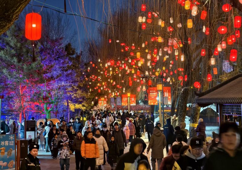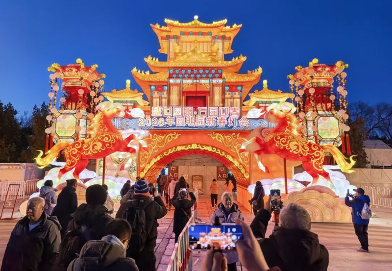 2月10日(农历小年)晚,2026圆明园新春灯会启幕,游客在入口处马年灯组前留影。灯会将持续至3月3日(正月十五)。