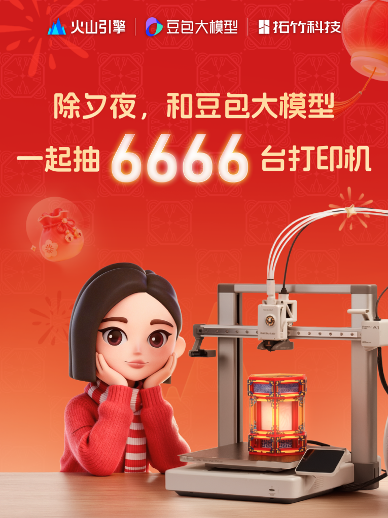 豆包与拓竹科技的合作更延伸到了春晚互动环节。2月16日,豆包App将配合春晚开启锦囊抽奖。在当晚的多轮互动中,6666台拓竹3D打印机也作为前沿科技代表入选。