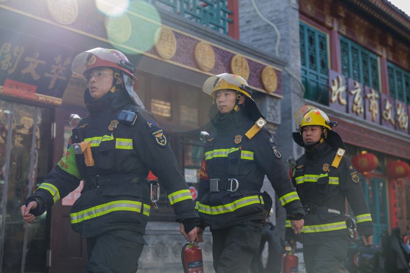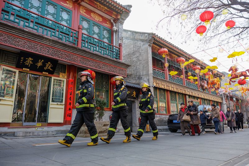 琉璃厂西街,消防员手持灭火器械巡逻。随着庙会预热活动展开,支队实施全方位、动态化安保。执勤力量携带轻便装备,在核心区及人流密集时段开展定点值守与流动巡查,构筑“动静结合”的快速响应网络。防火监督员每日开展多轮次现场检查,紧盯电气安全、可燃物清理等环节,及时消除动态隐患。