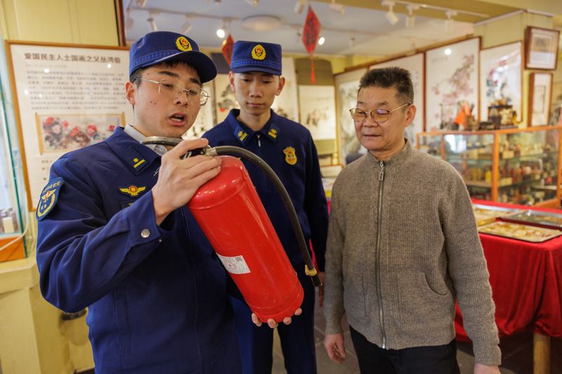 琉璃厂的一家商铺,消防员检查灭火器并宣传安全知识。在正月初一至初七庙会正式举办期间,西城区消防救援支队将在庙会现场设立“消防科普互动专区”,通过趣味游戏、装备体验、知识问答等丰富形式,与游客开展面对面互动,在普及消防安全知识的同时,也将为参与活动的市民送上具有消防特色的新春小礼物,让安全宣传更接地气、更有温度,实现“寓教于乐、平安同行”。
