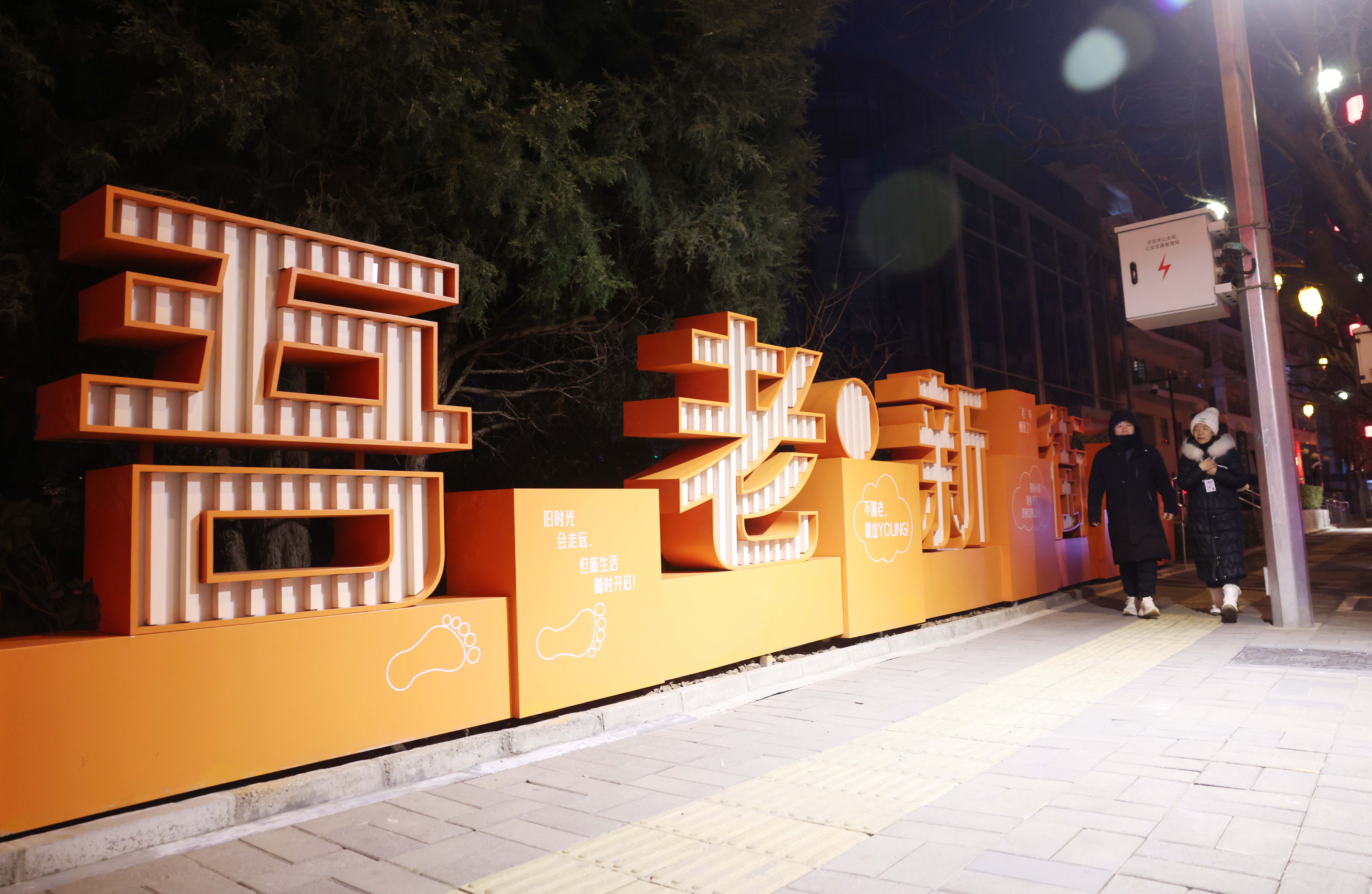 夜幕中的北草厂胡同,被金色和红色的灯笼照亮,三三两两的行人在街灯里散步,宁静喜庆的氛围中,胡同一侧红色的“吾老·新街”字样清晰可见。
