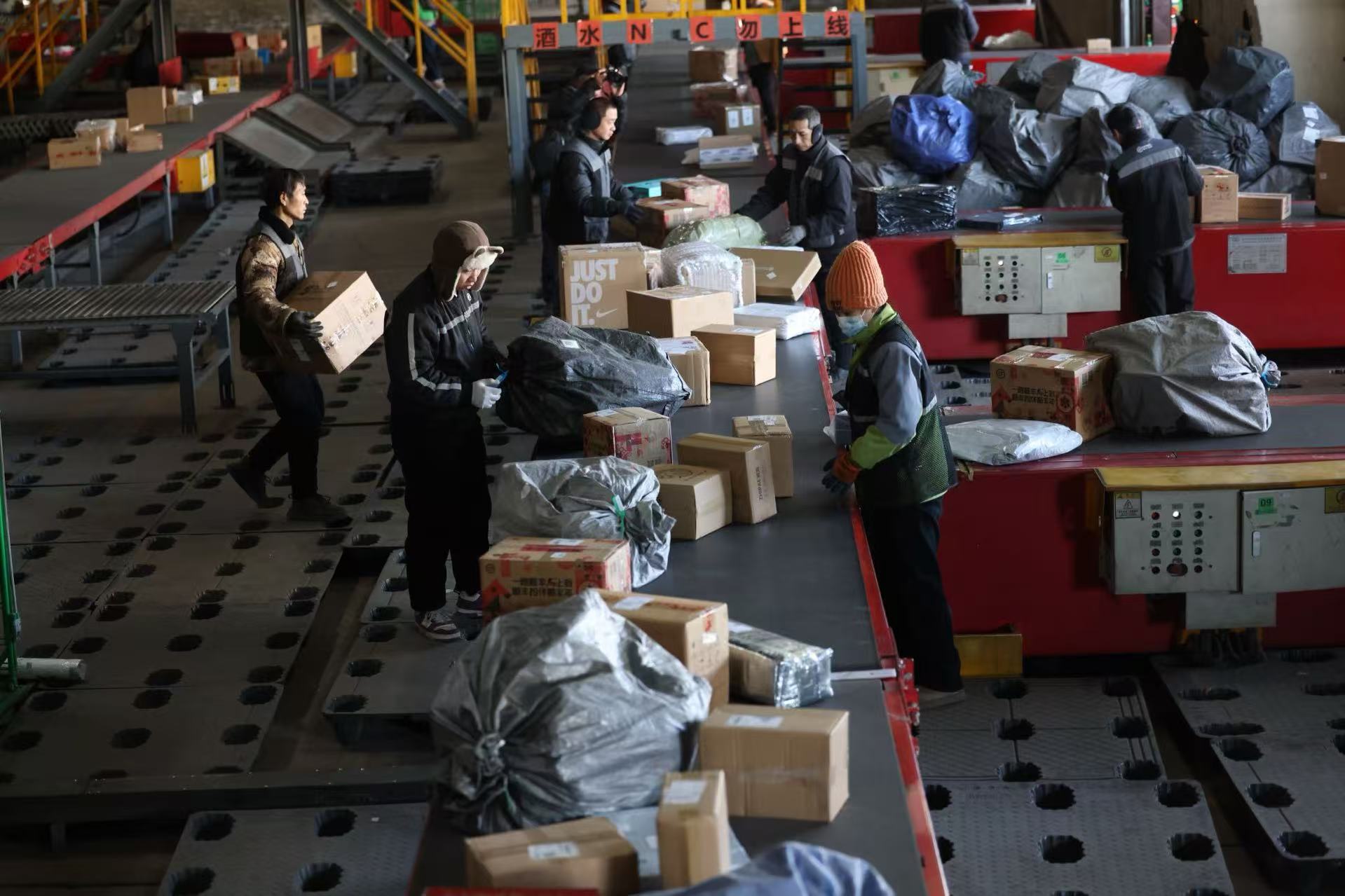 多家快递物流企业的员工正在分拣货物。新京报记者 王贵彬 摄