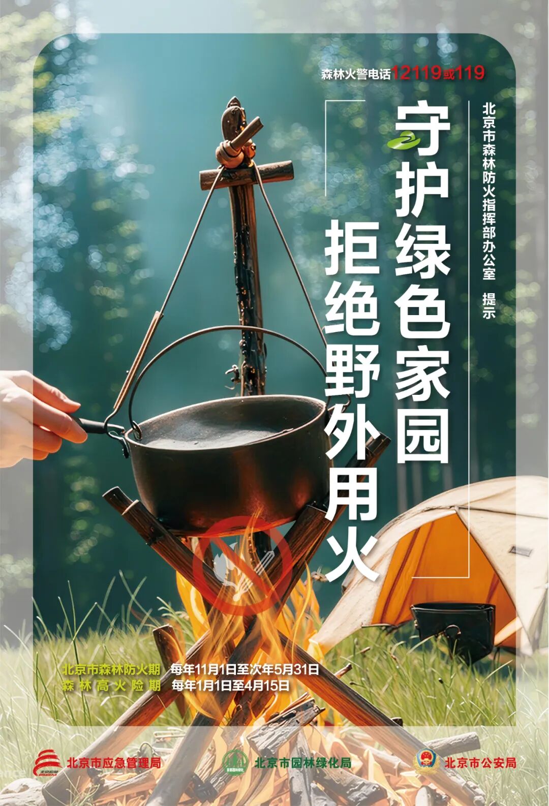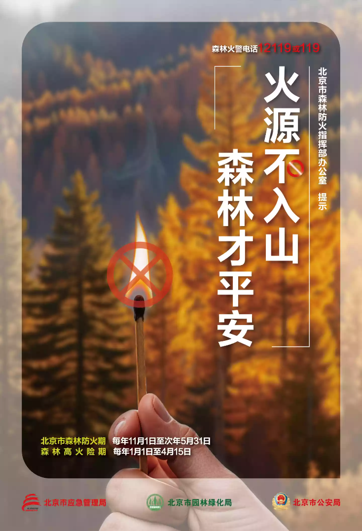 新京报讯 据北京应急微信公众号消息,马年行大运,防火保平安,北京市森防办提醒您:当前全市处于森林火险黄色预警,天干物燥容易发生森林火灾。请广大市民自觉遵守有关法律法规,进山入林做好登记并接受防火检查,不携带火种进山入林,不在森林防火区野外烧火取暖、吸烟、点放孔明灯、燃放烟花爆竹、祭祀烧纸和烧秸秆、熏肥等,防止引发森林火灾。一旦发现森林火情,请在确保自身安全情况下,第一时间拨打12119或119报警。感谢您对首都森林防灭火工作的大力支持,祝您马年吉祥!