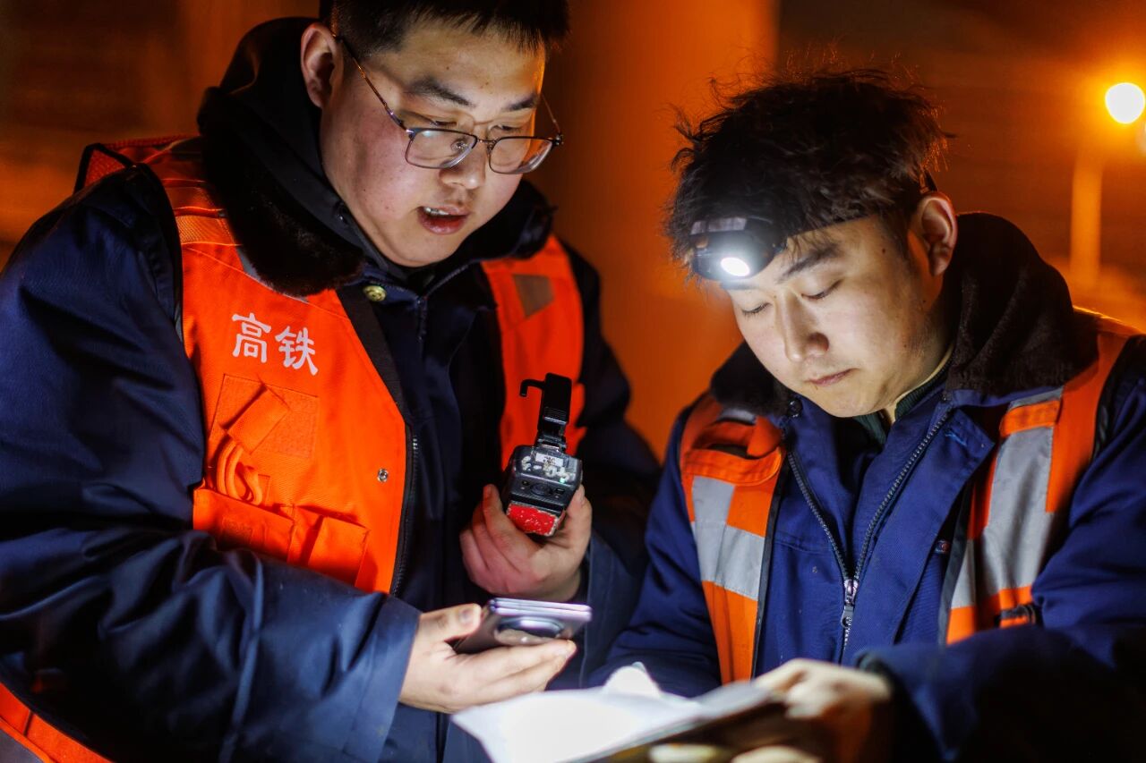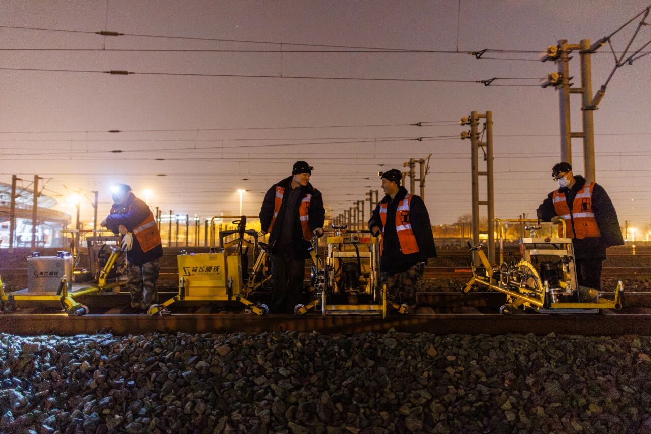 国铁北京局北京高铁工务段廊坊高铁线路车间北京南维修工区的工人们,只能在凌晨0:30至4:30的“天窗时间”进行作业,此时,高铁线路暂时封锁,没有列车通行。北京南维修工区负责北京南站城际场、高速场共计75组道岔、38公里线路的养护维修任务。春运里,列车开行密度增加,可供维修高铁线路的“天窗”减少,因此,工友们更加抓紧在轨道上进行养护维修的时间,以保证钢轨的状态良好,让乘坐列车的旅客安心回家过年。