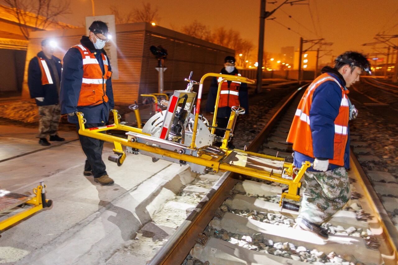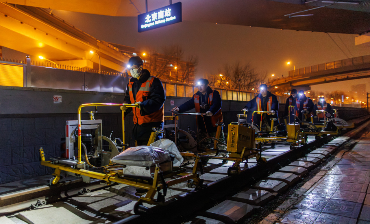 2月10日凌晨,北京南站,工人们推动打磨机为铁路轨道实施“毫米级”修整。