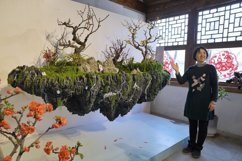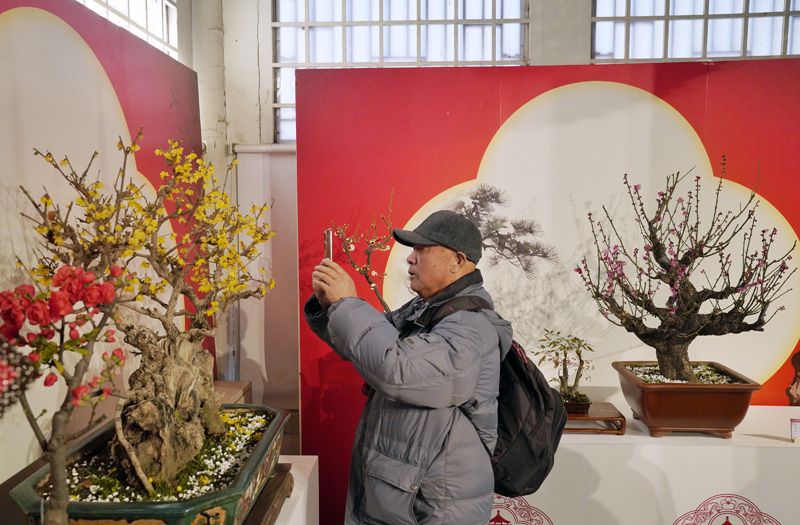游客在畅观堂景区欣赏精品盆栽。畅观堂荟萃独干式、临水式、斜干式、组合式等六大盆景形制,展示了颐和园盆景修剪造型技艺和精细化养护水平。
