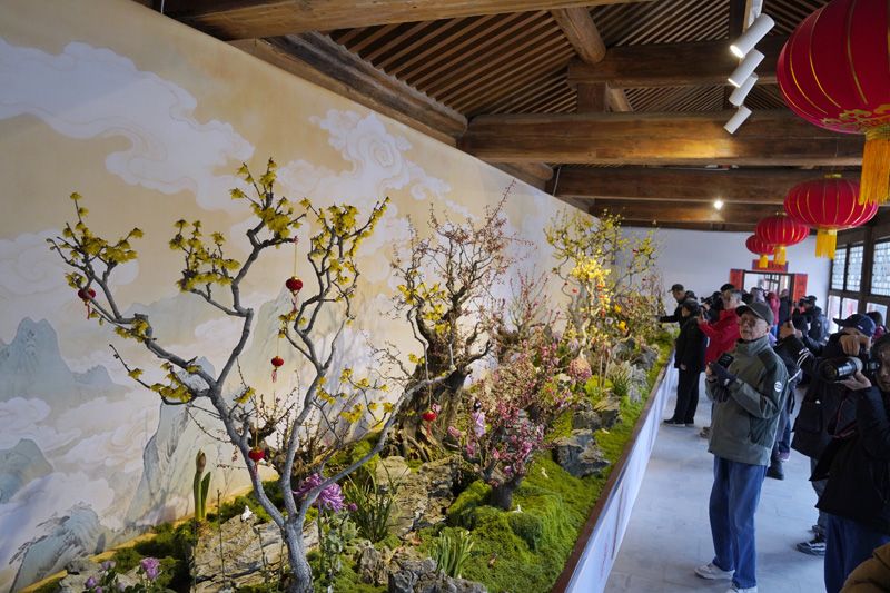 2月12日,颐和园第十五届“傲骨幽香”梅花、蜡梅迎春文化展开幕,游客在十间房景区欣赏15米长卷《百骏图》。长卷以梅、兰、菊、松等传统花木为元素,融入百骏奔腾意象,寓意国运昌隆。