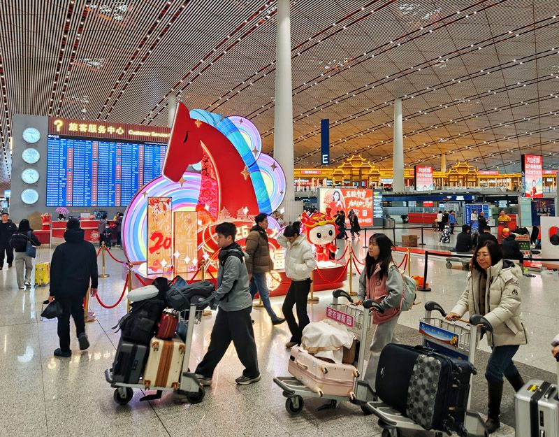 旅客走进首都机场T3航站楼出发层准备办理乘机手续。据民航局预测数据,节前2月13日至15日、节后2月22日至23日,首都机场客流集中度高,日均超过21万人次。