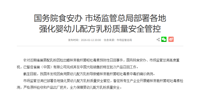 市场监管总局已部署各地强化婴幼儿配方乳粉质量安全管控,督促所有生产企业开展蜡样芽胞杆菌呕吐毒素检测,严格原料验收和产品出厂把关,全力保障婴幼儿配方乳粉质量安全。