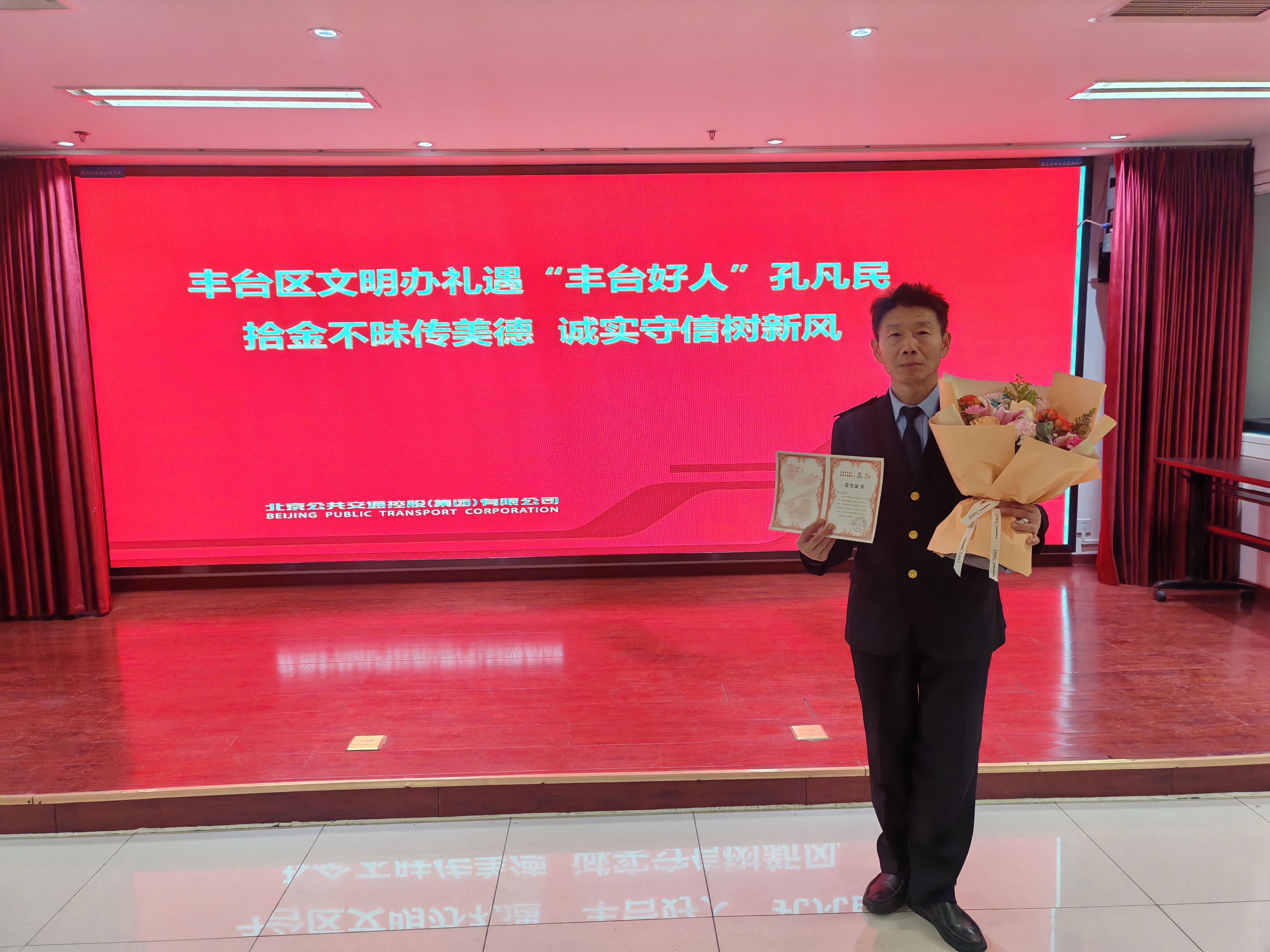 新京报讯(记者耿子叶)2月10日,北京市丰台区文明办举行“丰台区月度好人”现场表彰仪式,为捡拾6公斤黄金交还失主的477路公交车司机孔凡民颁发证书和鲜花。