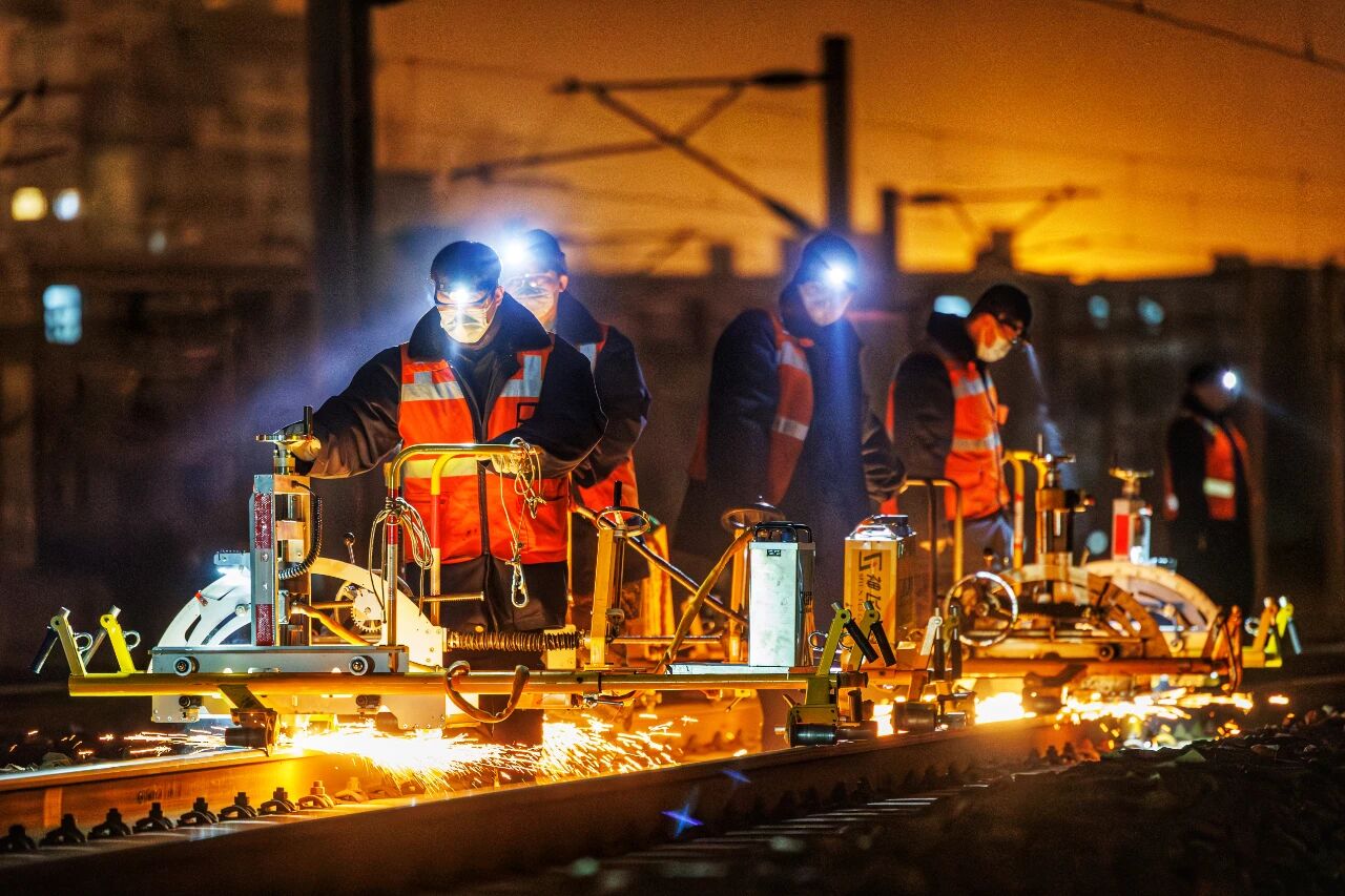 2月10日凌晨,北京南站,工人们推动打磨机为铁路轨道实施“毫米级”修整。