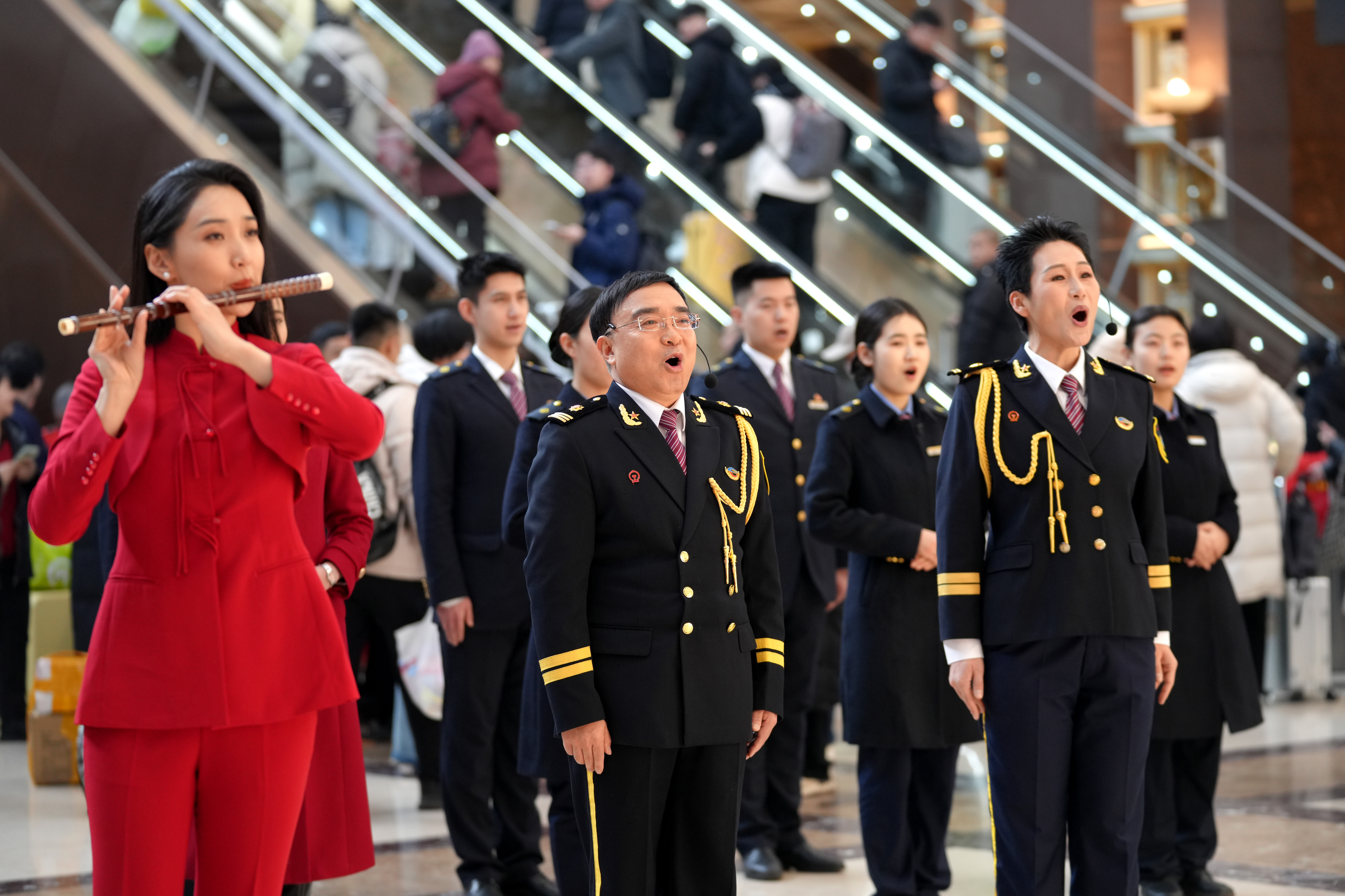 除了送福字的活动,现场还洋溢着动人的旋律。国铁北京局的职工代表共同唱响歌曲《坐着高铁看中国》,展现铁路人的奋斗豪情与时代风采。被网友亲切称为“国民闺女”的中国歌剧舞剧院竹笛、排箫演奏家孙楚泊现场伴奏,悠扬的笛声与铿锵的歌声交织共鸣,将现场气氛推向高潮。候车旅客纷纷举起手机拍摄、记录这一时刻。