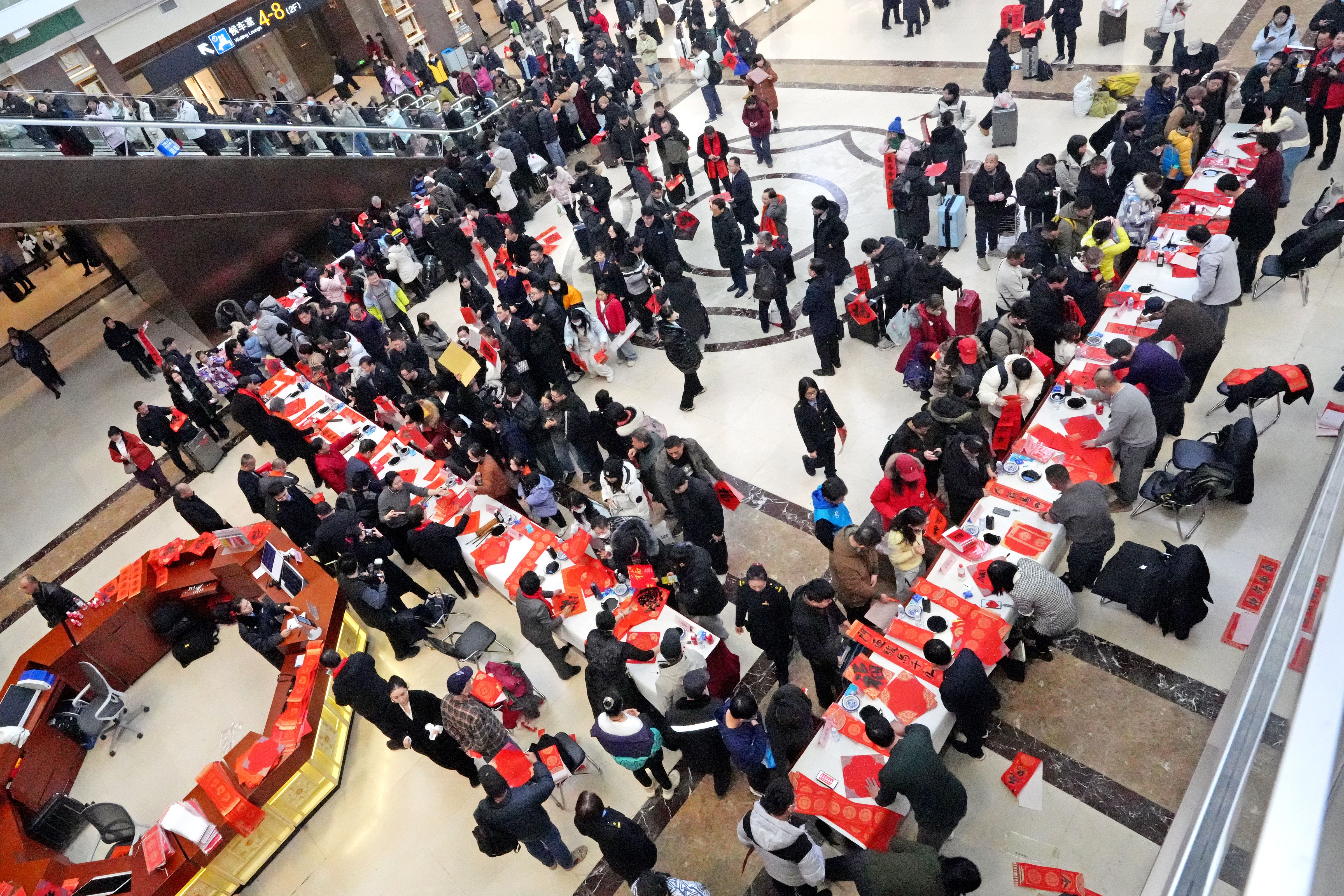 活动现场,来自中国书法家协会、中国职工书法家协会及铁路书法家协会的30余位书法家挥毫泼墨,书写“福”字和春联。过往的旅客们纷纷驻足欣赏,不少人满怀期待排队求取“墨宝”。