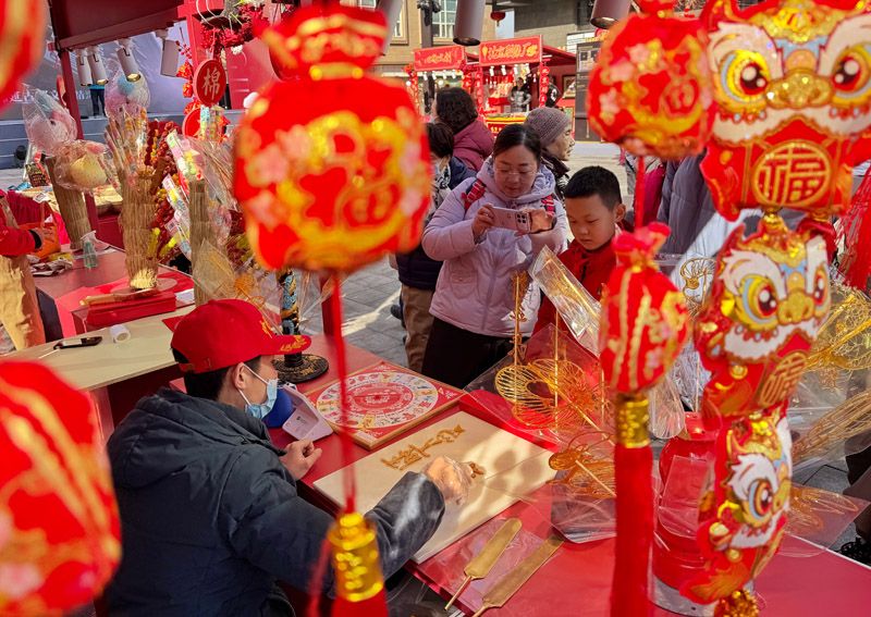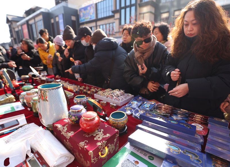 市民挑选景泰蓝。本次隆福寺新春市集的一大亮点,便是超30家老字号扎堆亮相,21个老字号和非遗摊位搭配8个老字号美食摊位,再加上隆福寺街区内的北京稻香村、同仁堂等老字号创新门店,形成了极具京味特色的老字号矩阵,各式马年新春特色产品琳琅满目,陪伴市民欢欢喜喜过大年。