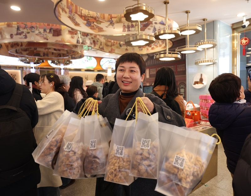 市民在北京稻香村 “零号寻宝馆”购买的食品。农历小年这天,习近平总书记在隆福寺北京稻香村门店购买的年货“三件套”(蜜三刀、奶油麻花和开花枣)成了市民排队购买的“爆款”。北京稻香村零号店店长曹思源告诉记者,今天“三件套”的火爆程度进一步升级,“我们早上准备了1000斤,不到下午两点就全部卖完了,食品厂那边安排了货车补货,又送过来了1000斤。”