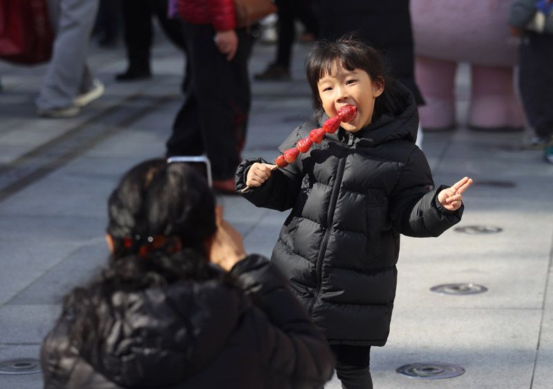 2月12日,北京隆福寺新春市集,小朋友观看糖画制作。