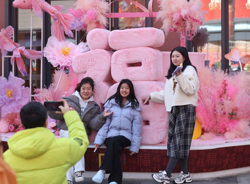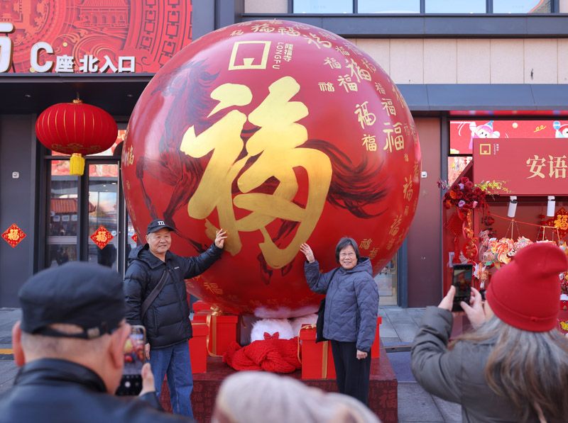 依托隆福寺的历史文化,新春市集以“福”文化为核心,打造了“隆福马”、百福灯笼墙、百福墙、福球等特色场景,并在隆福大厦东侧设置了北京目前最大的“福”字。图为市民在“福”字前打卡。