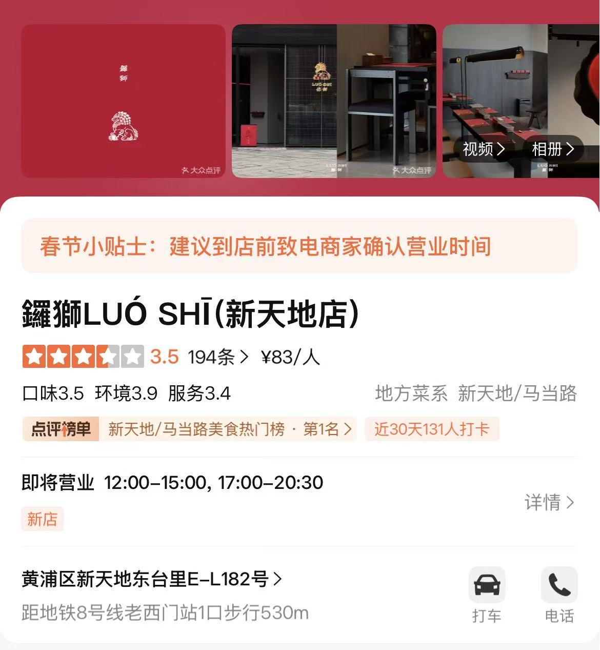 (来自某头部点评平台,鑼獅LUÓ SHĪ(上海新天地)门店信息)