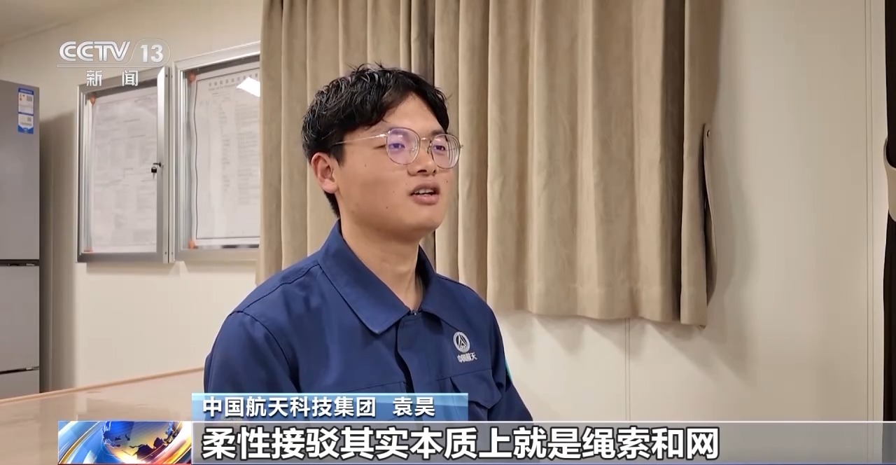中国航天科技集团 袁昊:柔性接驳本质上就是绳索和网。绳索和网都具有弹性,通俗来说,柔性接触了一个物体,就叫柔性接驳。整个工作流程可以分为看到、思考、动作三个过程。