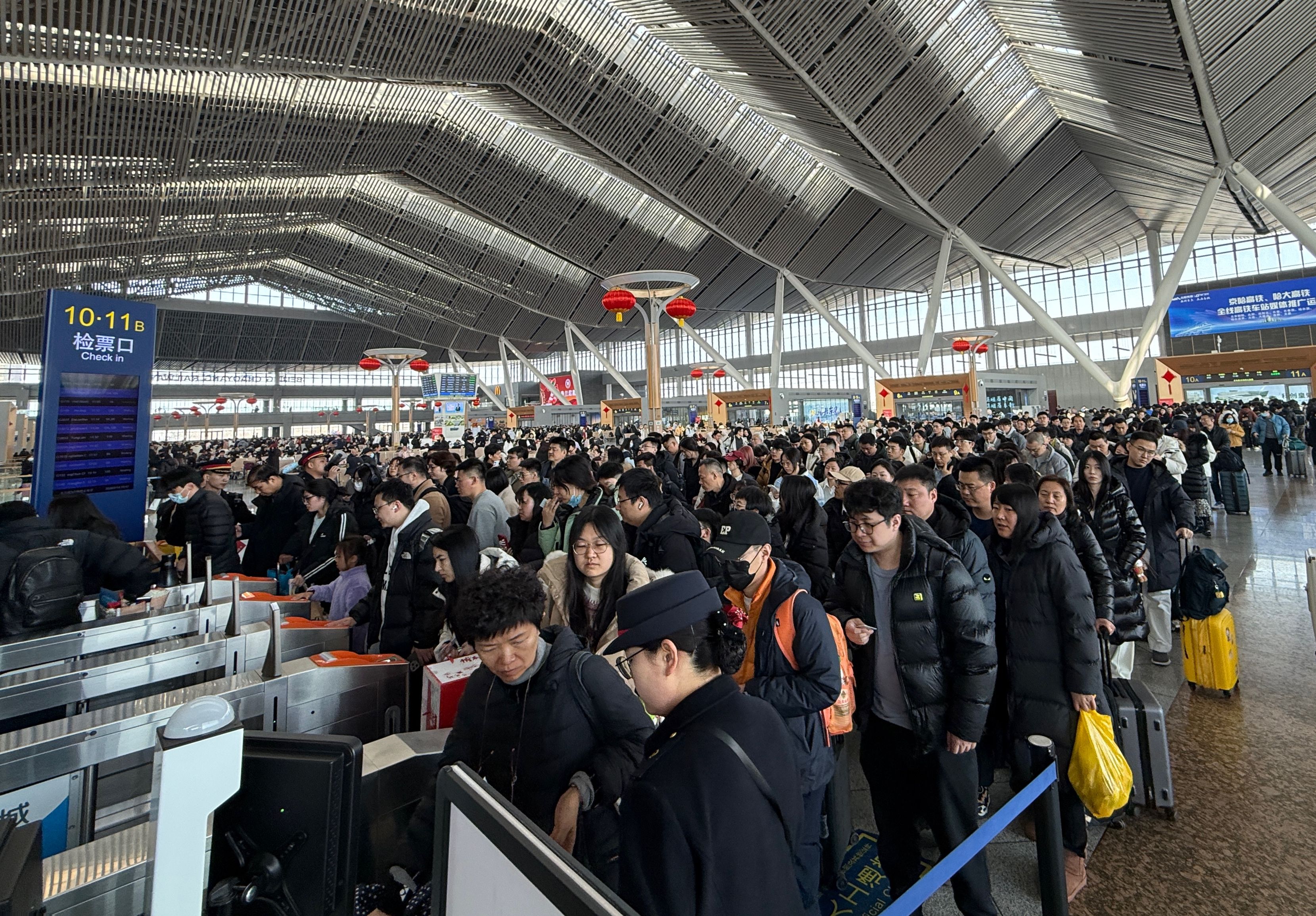 2月14日,北京朝阳站迎来客流高峰,旅客在站内候车。新京报记者 王贵彬 摄