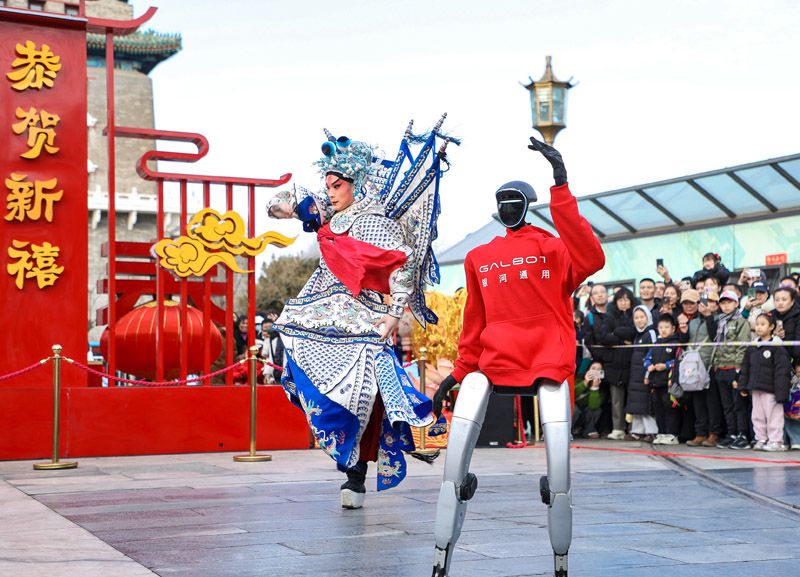 2月14日,前门大街,AI机器人、京剧演员同台表演。正月初一至初五,民俗巡游每日主题不同:初一舞龙表演结合老北京叫卖非遗表演;初二至初四“醒狮采青”舞狮及杂技表演展示非遗绝活;初五“财神送福”传递财运好彩头。AI机器人将化身“街头艺人”,不仅参与巡游互动,还将现场表演制作咖啡与煎饼,为游客带来“黑科技”烹饪体验。
