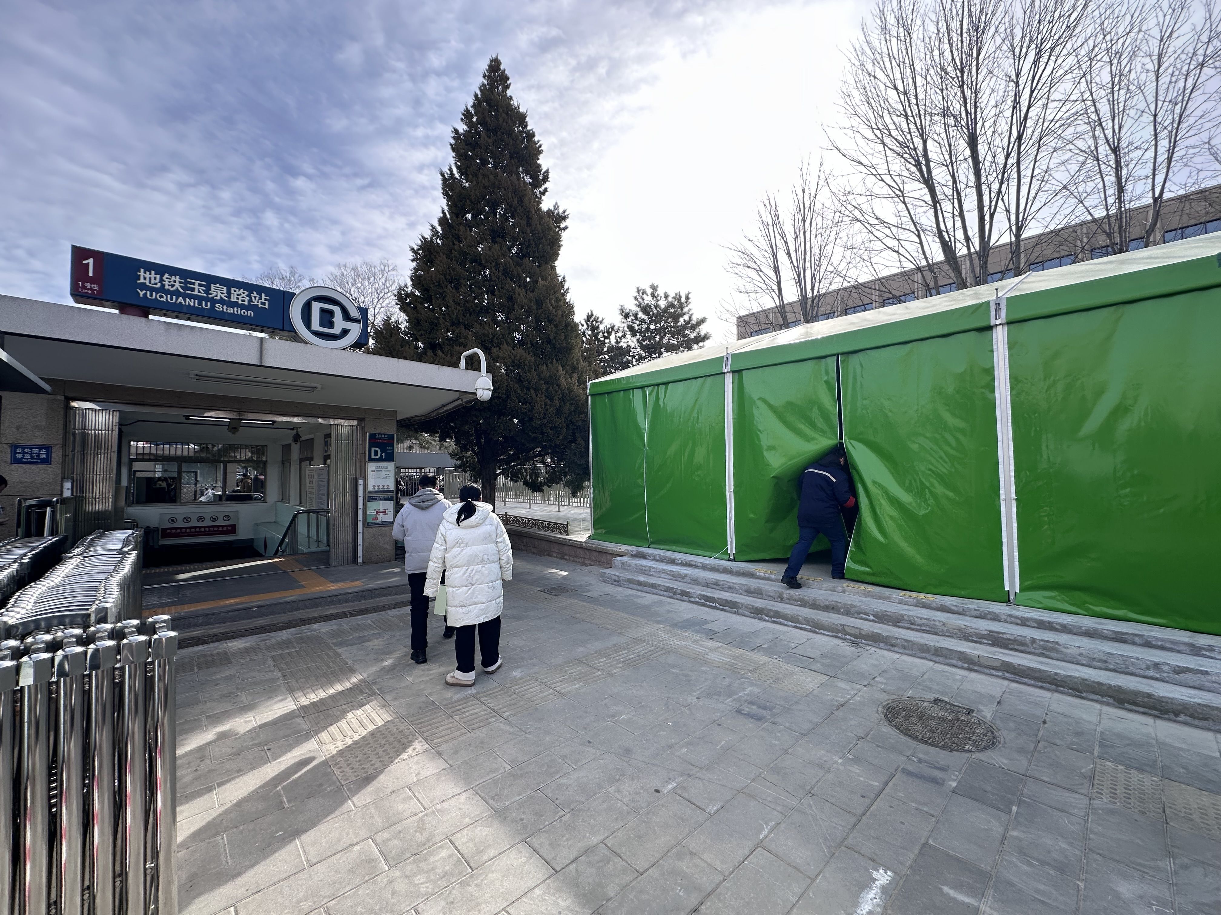 玉泉路地铁站D口外搭建了一处安检大棚。新京报记者 裴剑飞 摄