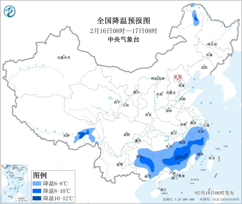 预计今天,冷空气将继续南下,开始影响江南、华南地区,江南中南部和东部、贵州东南部、华南北部和西部等地大部将先后降温6~8℃,其中,江西南部、福建西南部、广东北部等地部分地区降温可达10℃。明天(17日)凌晨最低温度0℃线将南压到江淮至江汉中部一带。中央气象台今晨继续发布寒潮蓝色预警。