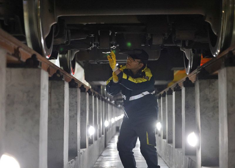 检修地沟空间狭小,李易手持强光手电逐一检查走行部、风源系统、制动系统、受流器等关键部件。李易和同事们对地铁列车的“诊疗”范围覆盖整车10余个系统,涵盖机械、电气等多个领域,包含数以万计的零部件。