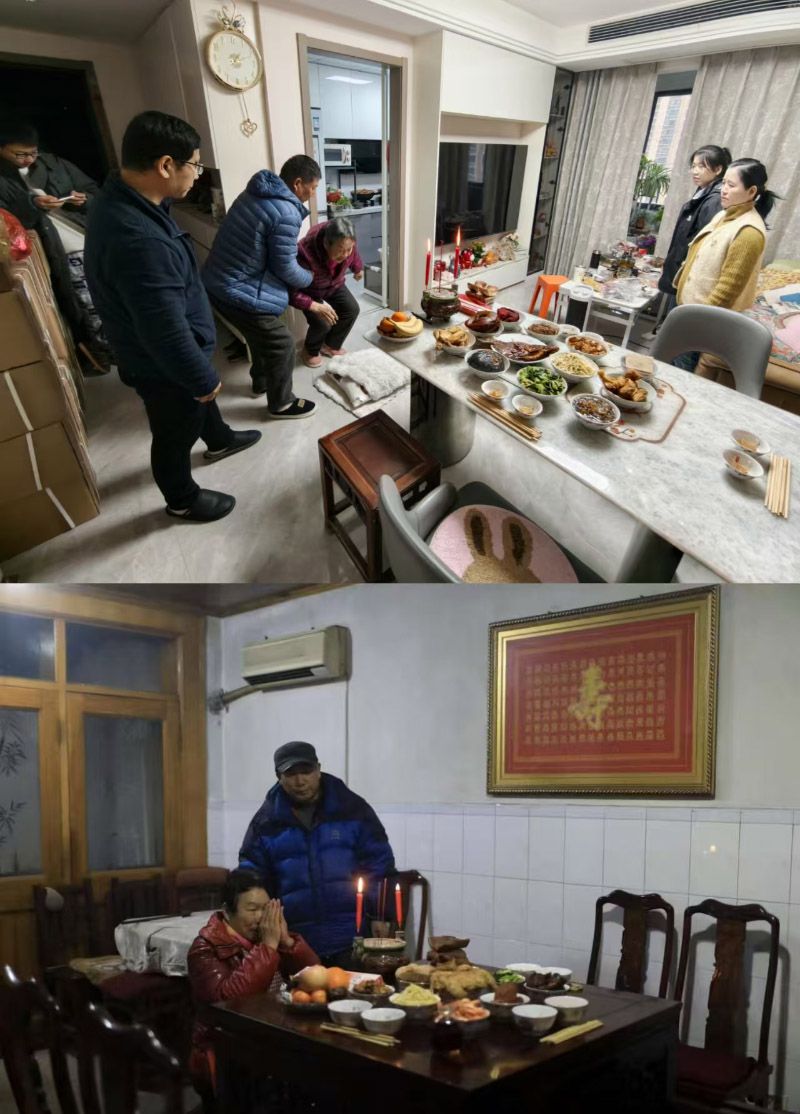 (上图)2026年2月16日,除夕,江苏无锡新吴区旺庄街道新光嘉园,从北京回老家过年的浦暄晨,与家人一同为相邻的爷爷家和大伯家张贴春联。当天,家中举行祭祖仪式。(下图)2024年2月9日,除夕,浦暄晨和堂姐浦静羽最后一次在老宅贴春联。