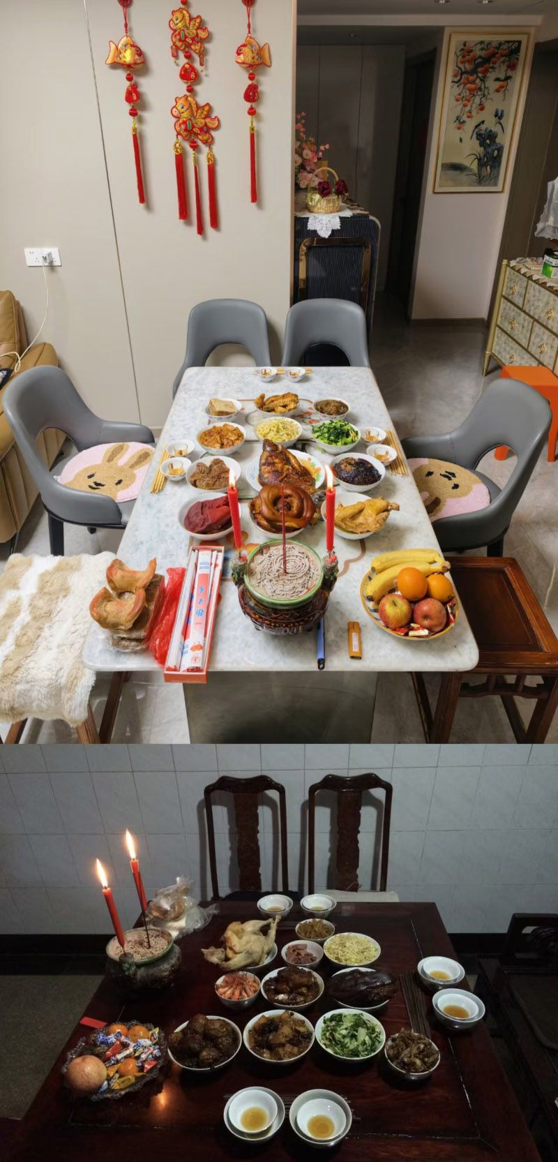 (上图)2026年2月16日,除夕,祭祖仪式开始,浦暄晨与大伯一同将日常餐桌旋转九十度,郑重地为祭祖仪式腾出主位。(下图)老宅祭祖的八仙桌用了几十年。今年彻底退出舞台。