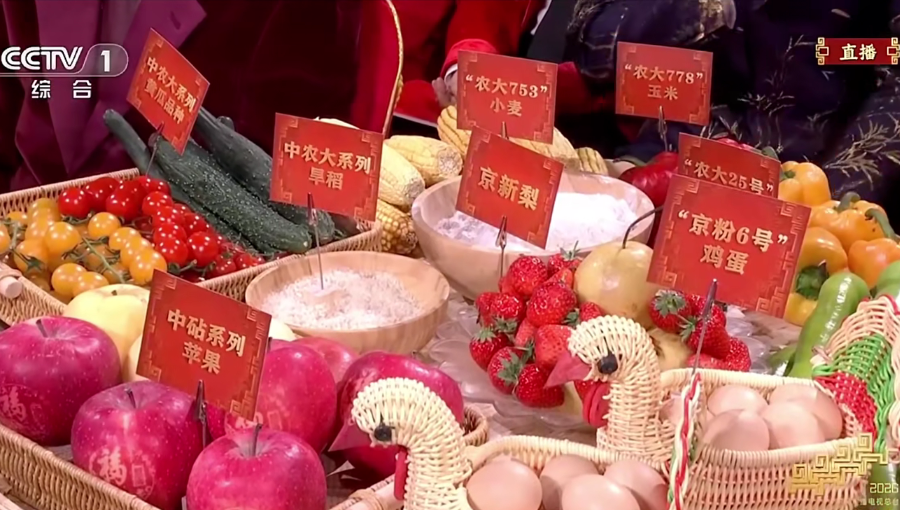 马年央视春晚上,中国工程院院士、中国农业大学农学院教授孙其信现场介绍,2025年,在全国广大农民朋友的共同努力下,我国粮食总产量再创历史新高,达到14298亿斤。他说,农民有坚守土地的信念,只要耕耘好脚下的土地,就会有丰收的希望。在春晚现场,他还晒出了多种最新的农产品,记者从中国农业大学了解到,这些多是中国农业大学科研团队出品的优质产品。其中,还有多种在北京育成,或以北京原有的传统品种改良而成。