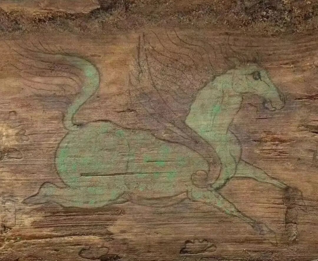 日前,新疆吐鲁番巴达木东墓群M20发现的中唐时期西州官员墓葬出土的木棺床的壶门上,发现了所谓彩绘的“翼马”,但细看的话会发现这匹“翼马”的头上长有一个犄角,因此,这匹翼马实际上是一头带有焰肩的麒麟。《说文》记载麒麟为“马身,牛尾,肉角”,也就是一匹独角马。肩部的所谓“翅膀”是自中国战国以来神兽身上装饰的火焰纹与自西亚传来的有翼神兽肩部的翅膀结合的产物。这一形象经常被误认为是所谓的“天马”“翼马”“飞马”。