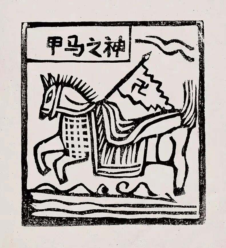 锡伯族所奉祀的祖先神灵“海尔堪玛法”正是这样一位白马神,当锡伯族人家中有了一匹良马,要先举行仪式奉献给海尔堪玛法,这匹奉献给神灵的马会洗刷干净,拴到神龛之前,全家人跪在神前,指着马对海尔堪玛法磕头祈祷,告诉神灵这匹驯养的骏马首先献给神灵骑乘,唯有在仪式结束后,凡人才能骑乘这匹马。在锡伯族的萨满神歌中,在萨满通往最高神“伊散珠”所在地萨满场院中,有十八位神灵把守着十八道“卡伦”(关卡),其中把守第三道“卡伦”的三位神灵“苏如鲁墨耳根”便是白马神。在中国道教的仪式中,马更是必不可少,往返于人间与天界的四值功曹,就被描绘成手捧文书的骑马官吏。在《灵宝领教济度金书》中,几乎所有的仪式都需要“焚化财马”。这里被焚化的“马”,便是所谓的“纸马”,是传统中国在酬神祈福祭祀中所使用的版画,其演化,恰如晚明学者宋焘在《泰山纪事》中所描述的那样: