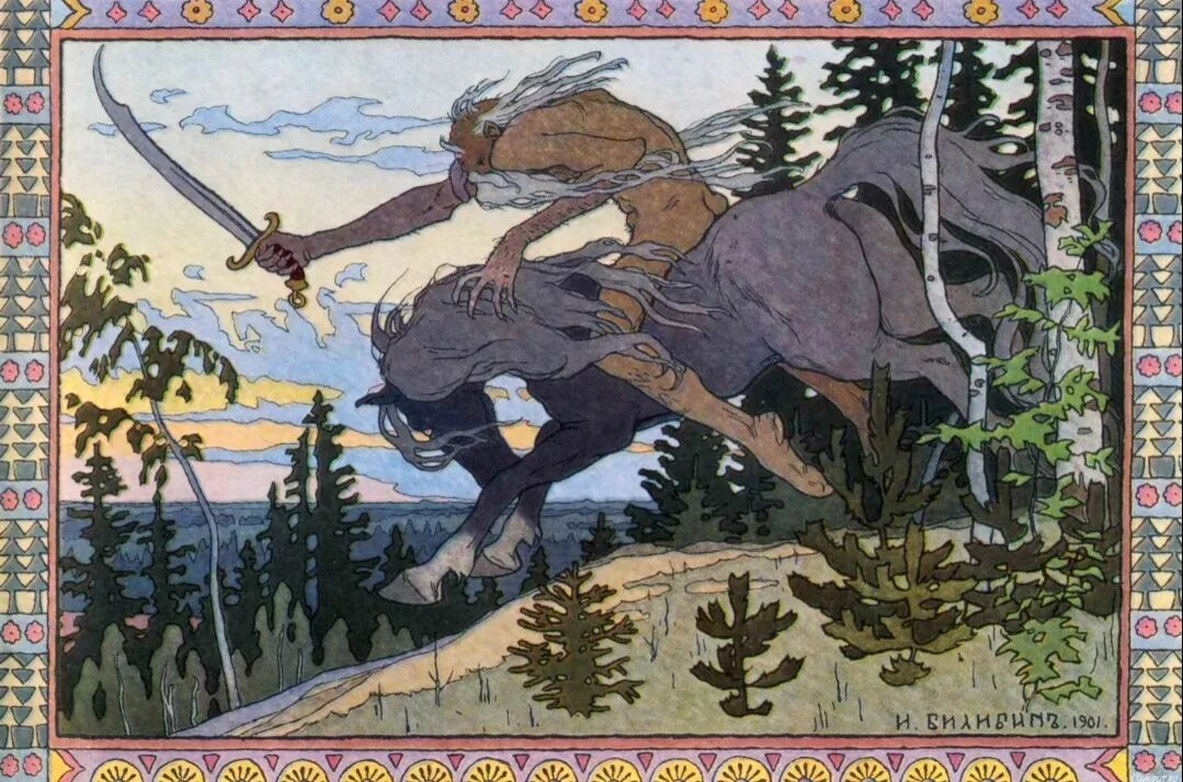 俄罗斯插画大师伊万·雅可夫列维奇·比利宾绘制的芭芭雅嘎的仆人科斯奇,科斯奇骑着魔马在森林山野为他的主人搜寻落单的旅人。在俄罗斯民间传说中,科斯奇会披上受害者的人皮伪装成他的样子去引诱下一个受害者。