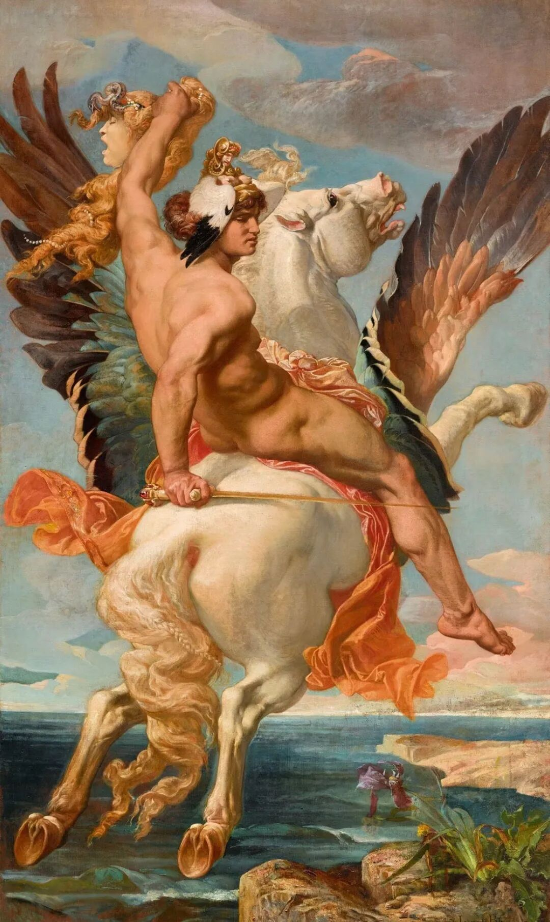 法国画家约瑟夫·布歇绘骑着飞马的珀修斯,他的手里还高举着飞马的母亲美杜莎的头。
