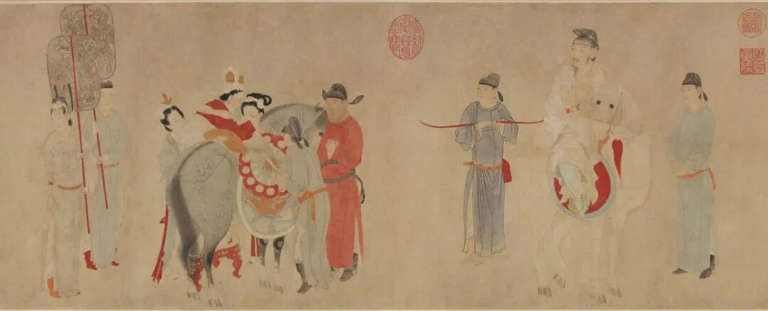传元代钱选《杨贵妃上马图》中骑在马上的唐玄宗回首望着正在上马的杨贵妃。