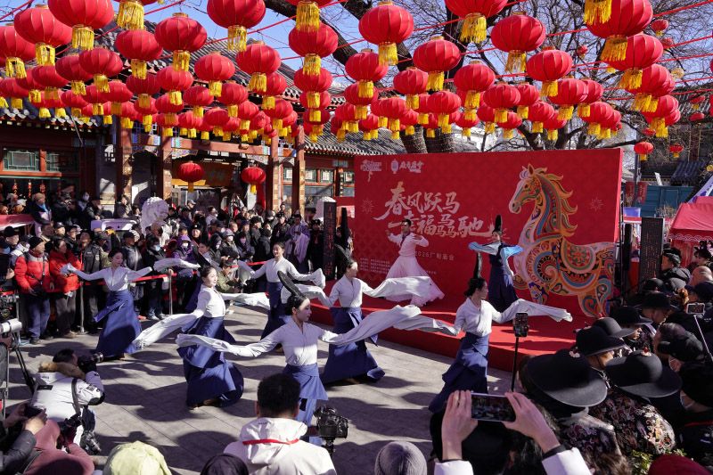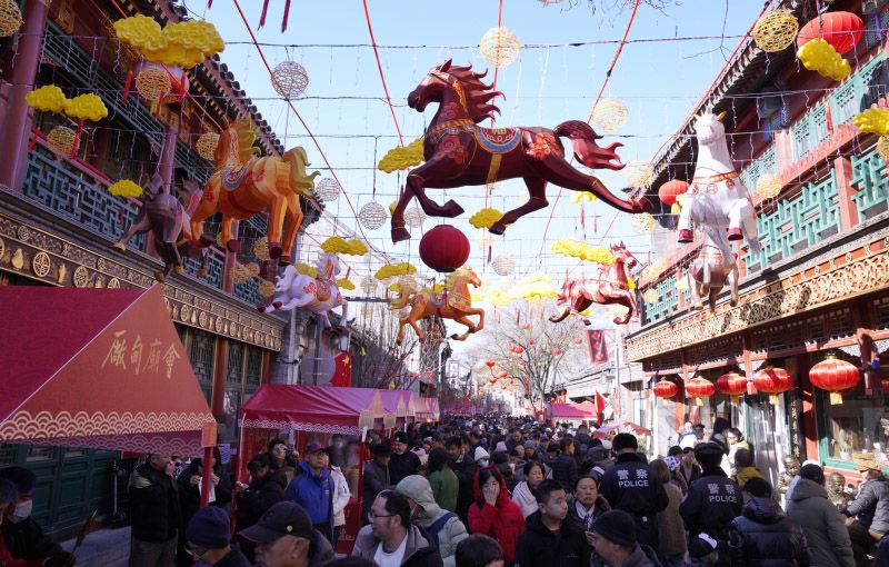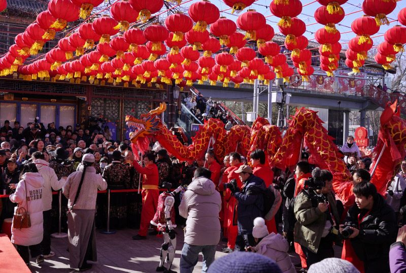 2月17日,大年初一,厂甸庙会开幕式上,舞龙表演吸引众多观众。拥有四百余年历史、首批列入国家级非物质文化遗产名录的厂甸庙会,2月17日至2月23日在琉璃厂东西街迎客,打造集文化展示、沉浸体验、文旅消费于一体的新春盛会。
