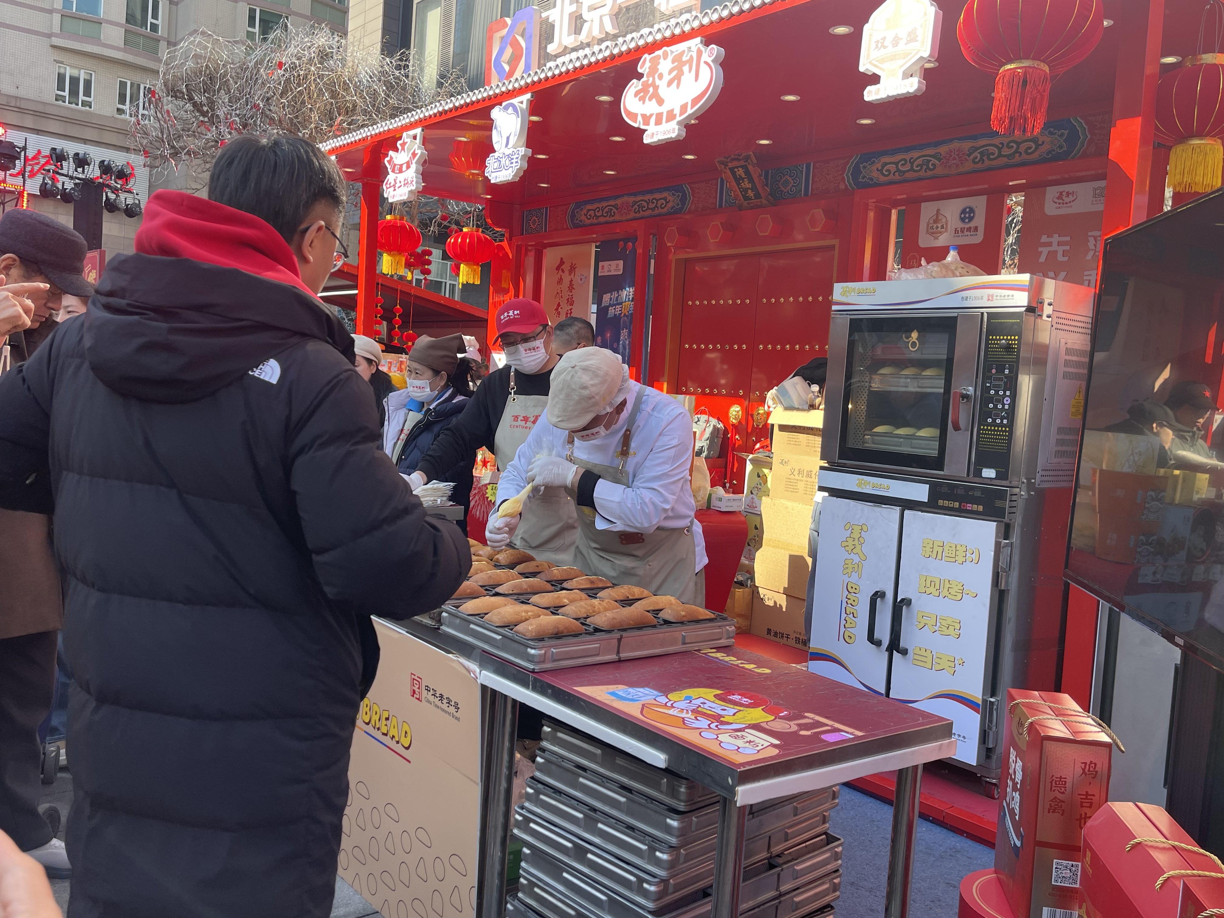 在义利面包摊位,排队的人群拐进了隆福大厦,工作人员大声地招呼着:“队尾在大厦里面,大家往里走,到里面排队。”一炉炉新鲜出炉的义利面包香气四溢,烘焙师在热气腾腾的面包上滴上黄油,黄油融化开,烘焙师再用刷子将黄油均匀地刷开,一个个胖乎乎、香喷喷的面包就完成了。市民郭小姐排了一个多小时的队才买到面包,她说:“义利的面包我平时也吃,但是这现烤现卖的是头一次吃,排队时间长一些也值。”