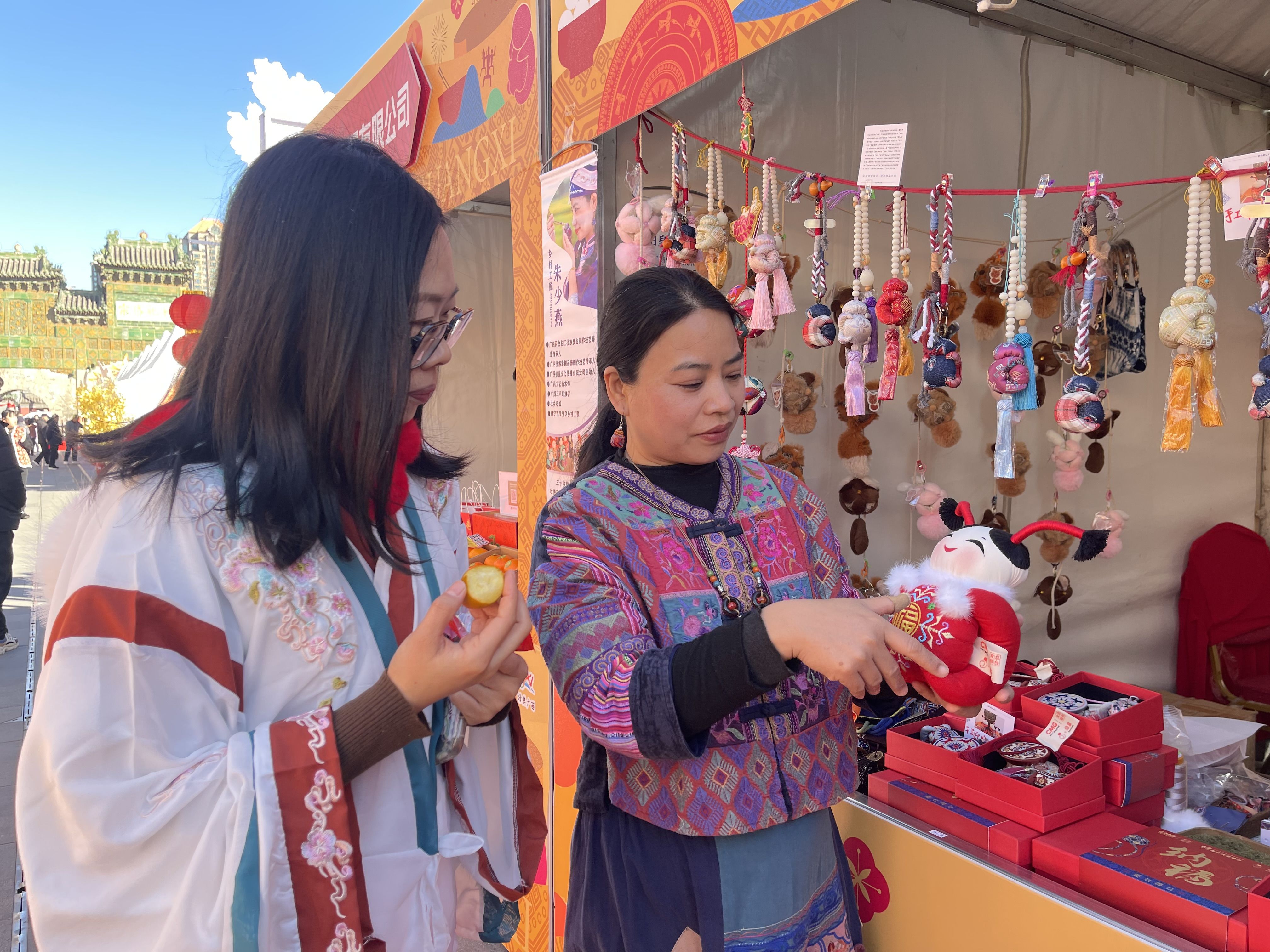 顺着市集往里走,一股药香扑面而来,这是广西非物质文化遗产麽乜(mō miē)散发出来的香味。工作人员介绍,麽乜的外观似娃娃,怀抱的龙珠里填充有香茅、艾草、菖蒲等草本植物。“麽,在我们的方言中是神明的意思,乜,是妈妈的意思。麽乜代表着双重守护的含义,在广西右江流域广泛流传,是一种吉祥物。”记者看到,摊位上除了传统外观的麽乜,还有车挂版的麽乜,此次进京,麽乜还戴上了毛茸茸的帽子,十分可爱。